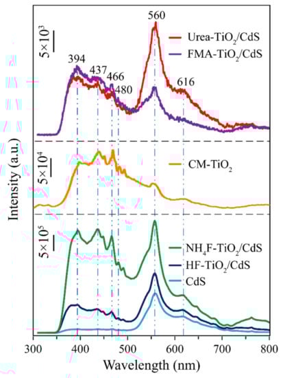 Photoluminescence (PL) spectroscopy is an efficient technique to characterize the separation and recombination of photogenerated electron-hole pairs on the photocatalyst surface [40]. As can be seen from Figure 7, CdS, CM-TiO2, and TiO2/CdS all exhibit obvious emission peak near 560 nm, which may be due to the rapid recombination of photogenerated electron-hole pairs [23]. In addition, compared with CdS sample, some other emission peaks were observed at 394, 437, 466, 480, and 616 nm in the CM-TiO2 and TiO2/CdS nanocomposites. The first emission peak at 394 nm can be attributed the emission of the band-band PL process of anatase TiO2, the other emission peaks can be attributed the excitonic PL process at the band edge of anatase TiO2 [38,41]. As the PL spectra are produced by the recombination of charge carriers, the lower emission intensity meanings lower recombination and higher separation efficiency of photogenerated electrons and holes [42,43]. In other words, the lower emission intensities indicate the existence of oxygen defects in the prepared TiO2/CdS nanocomposites [44,45] The PL emission peak intensities of FMA-TiO2/CdS and Urea-TiO2/CdS are much weaker than pure CdS, CM-TiO2, NH4F-TiO2/CdS, and HF-TiO2/CdS samples, indicating the better separation of photogenerated electrons/holes. Remarkably, FMA-TiO2/CdS nanocomposite exhibits the lowest PL intensity in all samples, indicating that the synergistic effects of the maximum specific surface and the TiO2/CdS heterostructure are beneficial to impede the recombination of photogenerated carriers and enhance the photocatalytic performance [46].