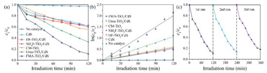 The ultraviolet-light-driven photocatalytic activities of TiO2/CdS composites prepared by adding different morphology capping agents in the mixed solution of H2Ti4O9 and CdS were measured by the degradation of the MO solution. As shown in Figure 9a, the optical absorption of MO did not change significantly in the absence of a photocatalyst, indicating the self-degradation of MO was negligible. Only 38.5% of MO could be photodegraded by HF-TiO2/CdS within 120 min, while the rate of photodegradation of MO by FMA-TiO2/CdS was 88.4% at the same time, and the degradation rate of MO increased in an order of FMA-TiO2/CdS (88.4%) > Urea-TiO2/CdS (67.1%) > CM-TiO2 (44.5%) > NH4F-TiO2/CdS (40.2%) > HF-TiO2/CdS (38.5%) = CdS (38.5%) > No catalyst (3.0%). For No catalyst, CdS, HF-TiO2/CdS, NH4F-TiO2/CdS, CM-TiO2, Urea-TiO2/CdS and FMA-TiO2/CdS photocatalysts, the corresponding reaction rate constants (k) were 0.0003, 0.0042, 0.0045, 0.0048, 0.0050, 0.0088, and 0.0167 min−1, respectively (Figure 9b). The FMA-TiO2/CdS composite exhibited the highest k value, approximately 55.7, 4.0, 3.7, 3.5, 3.3, and 1.9 times larger than those of No catalyst, CdS, HF-TiO2/CdS, NH4F-TiO2/CdS, CM-TiO2, Urea-TiO2/CdS samples, respectively. The degradation efficiency and k value of the FMA-TiO2/CdS composite are the highest, indicating that the FMA-TiO2/CdS composite has the best photocatalytic activity. The stability of the FMA-TiO2/CdS composite for MO degradation was measured by the cyclic experiment (Figure 9c). After three cycles, the degradation rate of the FMA-TiO2/CdS composite was 82.1%, decreased by 6.3%, indicating that the FMA-TiO2/CdS composite was stable.