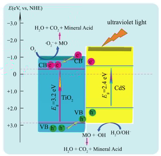 It is widely accepted that the crystal structure, specific surface area, separation efficiency of photogenerated electron–hole pairs and exposed facets play an important role in the photocatalytic reaction [48,49,50]: the suitable heterostructure, the larger specific surface area, the higher separation efficiency of photogenerated electron–hole pairs, and the higher reactive exposed facet are conductive to the improvement of the photocatalytic activity. A possible photocatalytic mechanism of TiO2/CdS heterostructure for the photodegradation of MO under ultraviolet light irradiation is shown in Figure 10. Under the ultraviolet light irradiation, the photogenerated electrons (e−) on the conduction band (CB) of CdS can easily transfer to the CB of TiO2 through the heterostructure interface owing to the CB potential of CdS (−0.89 eV) is more negative than that of TiO2 (−0.30 eV), in contrast, the photogenerated holes (h+) on the valence band (VB) of TiO2 can migrate to the VB of CdS through the heterostructure interface owing to the VB potential of TiO2 (+2.90 eV) more positive than that of CdS (+1.45 eV) [5,40]. The separation of the photogenerated e− (in TiO2) and photogenerated h+ (in CdS) decreases the recombination of photogenerated e−/h+ pairs, thus enhancing the photocatalytic activity of TiO2/CdS nanocomposites. Consequently, the photogenerated h+ on the VB of CdS can directly oxidize the water molecules absorbed on its surface to generate ·OH radicals, meanwhile, the photogenerated e− on the CB of TiO2 can directly reduce the oxygen molecules absorbed on its surface to form ·O2ˉ radicals. The generated ·OH and ·O2ˉ radicals have strong oxidability, which can oxidize MO into water, carbon dioxide, and mineral acid. The possible photocatalytic degradation mechanisms are described as follows [40]: