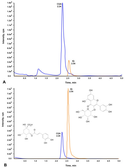 Chromatograms of CGA and IQ found in C. olitorius aqueous extract. (A) CGA and IQ present in CO, and (B) standard compounds (CGA and IQ).