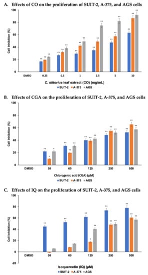 One approach to finding agents to prevent cancer cell proliferation and tumor formation is to study natural agents sourced from nature. In Asia, C. olitorius is a common leafy vegetable widely used in preparing dishes [34] and traditional medicine [13,14]. Pharmacological studies have shown that C. olitorius exhibits promising antioxidant and anti-inflammatory activities [35] beneficial for treating different cancers [18]. Therefore, in this study, we evaluated the anticancer properties of CO and its bioactive compounds, namely CGA and IQ, against various human cancer cell lines. Our data revealed that CO has significant antiproliferative effects on SUIT-2, A-375, and AGS cells at a concentration as low as 2.54 mg/mL.