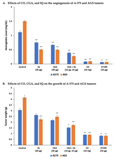 CO, CGA, IQ, and CGA + IQ inhibited angiogenesis and tumor growth of A-375 and AGS cancer cells. (A) Hemoglobin level measured from the CAM-implanted tumors after eight days. (B) Weight of the A-375 and AGS CAM tumors eight days after implantation and treatment. Data are represented as mean ± SEM (n = 3). * p < 0.01, ** p < 0.001 versus the control (untreated) group.
