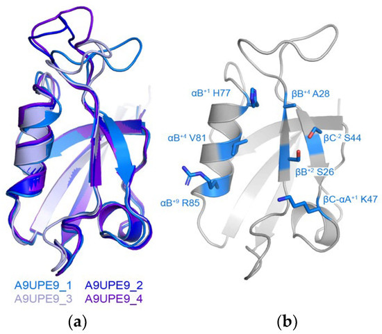We also wanted to use the online Robetta server for de novo structure prediction to generate a model of A9UPE9 (Figure 3) [64]. Robetta output four conformations that mainly differed in the conformation of the βB–βC loop, and alignments revealed RMSD values for main chain atoms, as compared with conformation 1 of 0.455 Å for 289 atoms (conformation 2), 0.530 Å for 291 atoms (conformation 3), and 0.679 Å for 311 atoms (conformation 4) (Figure 3a). Due to the similarities, we restricted our structural analyses to conformation 1. The structure, as well as sequence patterns, allowed us to identify the relevant peptide-binding cleft residues (Figure 3b).