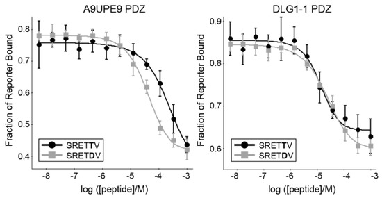 We next wanted to interrogate preferences at specific positions along the peptide, as well as to broadly compare binding affinities of known PDZ targets to the A9UPE9 and DLG1-1 PDZ domains. Starting with the HPV18 E6 C-terminal sequence, we designed a number of peptides to test specific peptide positions, including HPV16 E6, HPV18 E6, SRETTV, SRETDV, RRETTV, and RRETDV, where underlined residues differ from HPV18 E6. As a control, we also tested human SNX27, SHANK1, and GIPC PDZ targets previously studied, including GIRK3 (sequence: ESESKV), BPIX (WDETNL), GAIP (QSSSEA), TYRP1 (PNQSVV), and B1AR (ASESKV), as well as previously identified mbSHANK targets, including A9V7Z4 (EDETAL), A9UP44 (QSESRL), and A9UXE1 (QDETAL) [48,54]. Example competition experiment binding curves are in Figure 6, and all KI binding affinity values are reported in Table 3.
