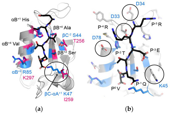 Then, using structural analyses of peptide-bound human PDZ domains, we identified seven key residues whose side chains interact directly with the peptide. Examples include peptide-bound structures of DLG1 PDZ2 (or DLG1-2), PSD95-1 (which is also referred to as DLG4-1), and ZO1-1 (Figure 2) [61,62,63]. These include: the βB+2, βB+4, βC−2, βC-αA+1, αB+1, αB+5, and αB+9 residues, where the secondary structure elements are as defined in Figure 1, the superscript numbers indicate residues from the N- (positive values) or C-termini (negative values) of those secondary structure elements, and “βC–αA” is the loop between the βC strand and αA helix. Notably, due to a high degree of variability in the length of the βB–βC loop amongst PDZ domains, we did not include residues in this structural element, although they can interact with peptide positions, e.g., P−4 and P−5. In addition, other residues make non-covalent interactions with peptide residues in individual PDZ domains, but we kept our assignments relatively conservative, limited to those that form the core of the peptide-binding cleft (Figure 2).