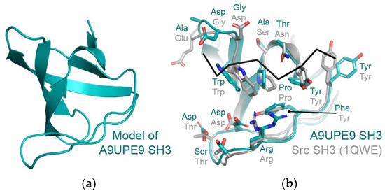 (a) A homology model of A9UPE9 SH3 is shown in cartoon representation. The template PDB ID used was 7CSO (Ephexin4 SH3). (b) The A9UPE9 and Src SH3 domains are in cartoon representation, with peptide-binding cleft residues in sticks, colored by heteroatom (N = blue, O = red) and labeled. The APP12 peptide is in black ribbon. Alignment of main chain atoms revealed an overall RMSD = 0.824 Å for 170 atoms.