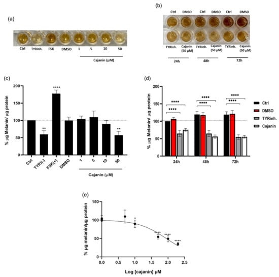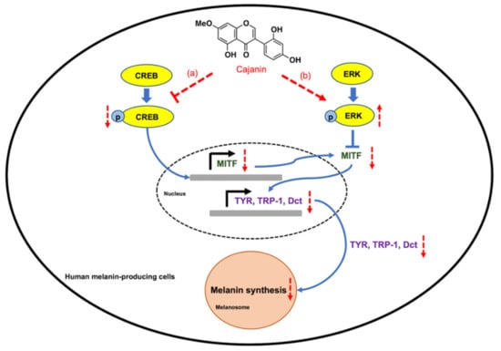 Netcharoensirisuk, P.; Umehara, K.; De-Eknamkul, W.; Chaotham, C. Cajanin Suppresses Melanin Synthesis through Modulating MITF in Human Melanin-Producing Cells. Molecules 2021, 26, 6040. https://doi.org/10.3390/molecules26196040