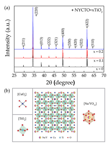 TiO2—rich Na1/2Y1/2Cu3Ti4+xO12 (NYCTO+xTiO2) ceramics (where x = 0.0, 0.1 and 0.2) were prepared using solid-state reaction method (SSR). The starting materials were Na2CO3 (99.9%), Y2O3 (99.99%), CuO (99.9%) and TiO2 (99.9%), which were purchased from Sigma–Aldrich (St. Louis, MO, USA). Details for the preparation of NYCTO—based oxides were provided elsewhere [28,30,39]. The mixed powders for all compositions were calcined at 1000 °C for 10 h. Mixed powders (without calcination) were pressed into 9.5-mm-diameter pellets by uniaxial compression at ~100 MPa. Finally, the pellets were sintered at 1070 °C for 10 h in air. The sintered NYCTO + xTiO2 ceramics with x = 0.0, 0.1 and 0.2 were referred to as the NYCTO, NYCTO + 0.1TiO2 and NYCTO + 0.2TiO2, respectively.