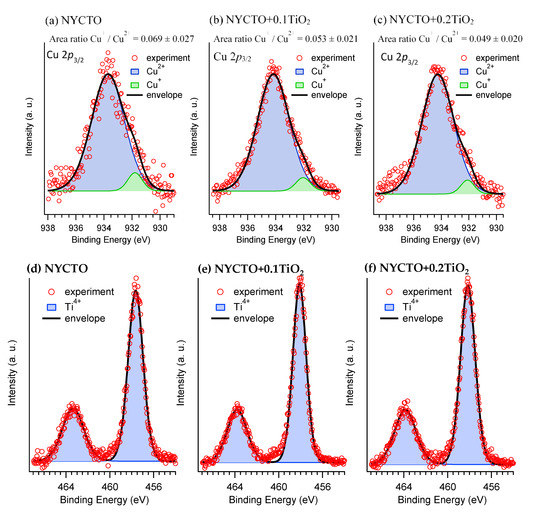 (a–c) XPS spectra of Cu 2p3/2 for all sintered NYCTO + xTiO2 ceramics. (d–f) XPS spectra of Ti 2p for all sintered NYCTO + xTiO2 ceramics.