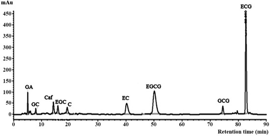 Column B (deactivated, endcapped monomeric C18, high-purity silica) was tested using methanol in the presence and absence of ethyl acetate mixed with either phosphoric acid or acetic acid as mobile phases modified from a previous report [33]. The separation was performed with ethyl acetate added to the mobile phase gave sharper peak shapes (C, EGCG, and GCG) than those with ethyl acetate absent [34,35,36]. Furthermore, acetic acid has the same effect on the separation, but is not as effective as phosphoric acid. The amount of phosphoric acid in the mobile phase was used in the range of 0.05–0.10% to improve the peak shapes of GA, EGCG, and GCG. Therefore, the separation of seven catechins (GC, EGC, C, EC, EGCG, GCG, and ECG), GA, and Caf. was achieved within 84 min under suitable isocratic condition, as shown in Figure 2 and Table 1.