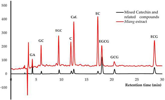 In Miang extract, sample matrices may cause a bias by increasing or decreasing the peak signal attributed to the measurement. Various extracts of Miang samples were analyzed by the validated method with column C to confirm the method’s suitability in determining and standardizing catechins and related compounds. The resulting chromatogram in Figure 3 was compared to a mixed standard. The contents of individual compounds in Miang extracts are shown in Table 4. A total of 75% ethanolic solvent exhibited the highest extractability of total catechins (at 60 °C for C, 70 °C for EGC and EGCG, and 80 °C for EC, GC, GCG, and ECG whereas 50% ethanolic solvent showed the highest extractability for GA at 80 °C, and Caf. at 60 °C. Note that the individual catechins, GA, and Caf. were stable at the obtained optimal extraction temperature below 90 °C, as confirmed from the results of previous studies [38]. Previous extraction kinetic studies found that some of the compound contents, including EGC, EC, and Caf., decrease when the extraction temperature increases to 90 °C. The results correspond with those of Liang et al. [39], who reported that 75% ethanol is the highest extractability of total catechins for fresh tea leaves. The individual catechin contents obtained from this optimal extraction, including EGC, C, ECG and EGCG, were higher than previous studies. Nonetheless, only GC and ECG showed lower extractability [15].