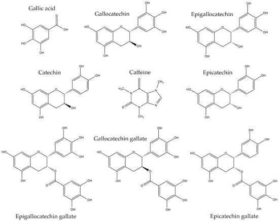 Tea (Camellia sinensis, family Theaceae) is the most frequently consumed beverage worldwide and a rich natural source of polyphenols, flavonoids, and alkaloids. Numerous studies have identified the characteristic constituents of tea leaves into two main groups: catechins and alkaloids. The active catechins are (+)-catechin (C), (−)-epicatechin (EC), (−)-gallocatechin (GC), (−)-epigallocatechin (EGC), (−)-catechin gallate (CG), (−)-gallocatechin gallate (GCG), (−)-epicatechin gallate (ECG), and (−)-epigallocatechin gallate (EGCG), whereas the major active alkaloid is caffeine (Caf.). EGCG is the major component of unfermented green tea, accounting for approximately 10–50% of tea catechins overall [1]. In fermented green tea, the major component is GC, with less EGCG content [2]. One of the most intriguing properties of tea catechins is protection against cancer, diabetes, hypertension, dyslipidemia, and cardiovascular diseases [3,4,5,6]. Several studies have reported that the antioxidant activity is higher in green tea due to higher amounts of EGCG and EGC [7,8,9]. In addition, tea contains caffeine, which stimulates the central nervous system and induces short-term increases in blood pressure [10].