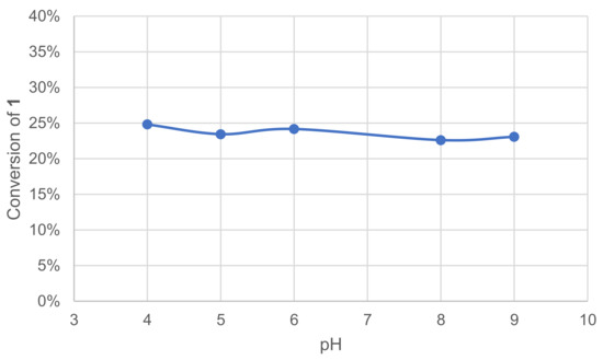 Laccases are known to have optimal pH ranges between 3.5 and 5 with hydrogen donor substrates [15]. To specifically evaluate the effect of pH on our reactions of interest, five different pH were tested (4–9), along with an additional test in deionized water (DIW). The effect was quickly assessed by monitoring the remaining 1 in the crude reaction mixture after extraction and GC/MS analysis (Figure 2).