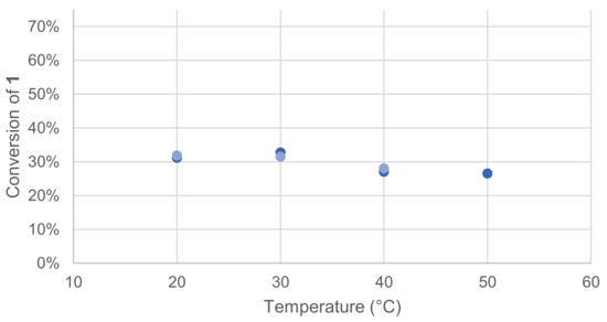 Laccases optimal temperatures are known to be in the range from 50 to 70 °C, but they can also exhibit activity at a lower temperature, such as physiological temperature [15]. To specifically evaluate the effect of temperature on our model reaction, four different temperatures were tested. Once again, the effect was quickly assessed by monitoring the remaining 1 in the crude reaction mixture after extraction and GC/MS analysis (Figure 3).