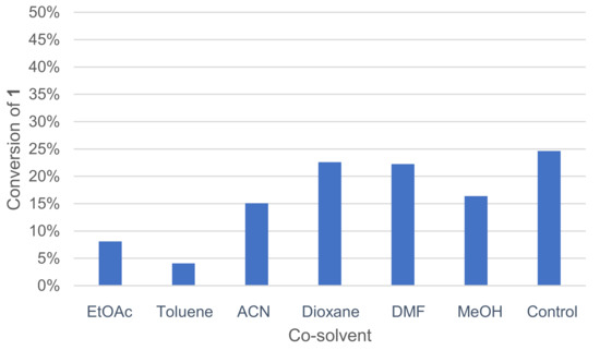 A co-solvent can be added to the medium to improve substrate solubility in water. The positive effect of co-solvent such as EtOAc on 2,6-dimethoxyphenol dimerization by Trametes pubescens laccase was already reported [42]. Various co-solvents, miscible or not with water, were tested, and the activity was measured by GC/MS analysis (Figure 4).