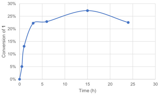 The assays showed that the conversion raised significantly over a 5h-period with an initial reaction rate of ca. 32 mM·h−1. Conversion plateau was reached at 25–30% after 10 h, and this might be due to enzyme and/or mediator deactivation. The preincubation of some components was thus investigated mostly to evaluate a possible inhibiting effect of substrate 1 on the enzymatic system. The enzyme and 1 were thus engaged in our conditions in the absence of a mediator, while in parallel, the mediator and 1 were engaged similarly in the absence of the enzyme. After 24 h, the laccase–mediator system was completed by the addition of the missing component and the reaction was run for another 24 h. No significant differences were observed between these two experiments and the one in Figure 6.