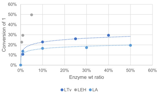Increasing enzyme quantity could help reach a better conversion into oxidation products, but the increase was somehow limited beyond 0.25. Laccase LEH, shown to be of the highest purity, was clearly superior for this reaction with oxidation products formed with more than 50% yield with only 5 wt%. Mediator quantity is also an important parameter in relation to enzyme quantity. Compared to the conditions of Figure 7, when the reaction was performed with 4-fold HOBt as the mediator, conversion of 1 increased by ca. 2-fold (not shown).