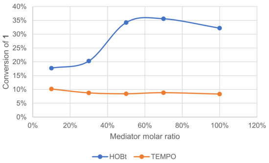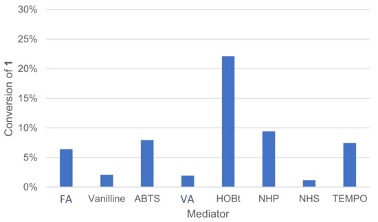 The mediator type had an important effect on conversion, and no or very little reaction occurred in our conditions when using N-hydroxysuccinimide (NHS), vanillin, violuric acid (VA) and ferulic acid (FA). The profile of oxidation products distribution was also affected by mediator choice. In the same proportion, HOBt converted more 1 than TEMPO, but HOBt produced more oxidative cleavage products, such as veratraldehyde 2 and 3-(3,4-dimethoxyphenyl)prop-2-en-1-one 3 than TEMPO (Figure 9). TEMPO was also able to convert 1 into 1-(3,4-dimethoxyphenyl)prop-2-en-1-one 4.