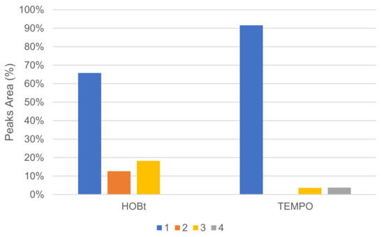Comparison of oxidation products using HOBt or TEMPO as %area in the crude product determined by GC/MS (LA 10%w/w, mediator 50 mol%, acetate buffer pH5 0.25 M, O2 atmosphere, incubation for 24 h, 40 °C, 200 rpm).