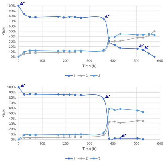 Sequential supply of fresh enzymes (top) and the mediator (bottom) marked with arrows for each addition of material (acetate buffer pH5, 6 mmol substrate 1 0.12 M, O2 atmosphere, 40 °C, magnetic stirring).