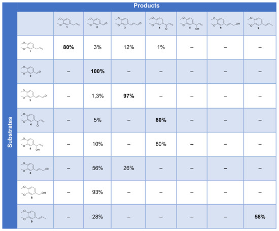 Methyl eugenol 1 is an allylbenzene derivative naturally produced by plants. It was identified as a product of lignin degradation in the presence of laccase from Trametes versicolor and methyl syringate as natural mediators [29]. As 1 is an allergen and a carcinogenic agent [30,31,32]. It is strongly regulated in food and cosmetics [33,34,35]. Its metabolization by microorganisms involves cytochrome P450, which is an oxidase [36,37]. Its antifungal and cytotoxic effects were also investigated [38,39].