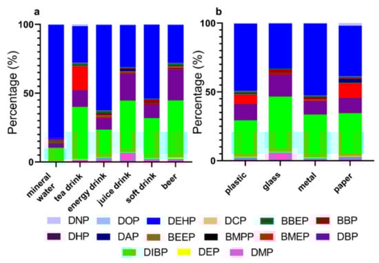To investigate the contribution of each phthalate to the total phthalate burden, we calculated the ratio of the mean concentration of each phthalate to the mean sum concentration of 15 PAEs (Table 3; Figure 1a). As shown in Table 3, DEHP, DBIP, and DBP are the three major PAEs detected in beer, soft drink, juice drink, and energy drink samples, with a contribution ratio of over 10% (or around 10%). The predominant compounds found in the four types of bottled drinks are DIBP, DEHP, DIBP, and DEHP, respectively, with the respective contribution ratios being 41.7%, 53.8%, 37.5%, and 62.1%. In mineral water samples, DEHP is the predominant PAE with a contribution ratio of 84%, followed by DBIP (ratio: 9.4%), and the contribution of DBP is minor (2.8%). In tea drink samples, besides DEHP, DBIP, and DBP, we also observed a significant contribution of BMEP to the sum PAE concentration with a contribution ratio of 17.1% (Table 2 and Table 3). This indicates that tea drink is an important source of human exposure to BMEP.