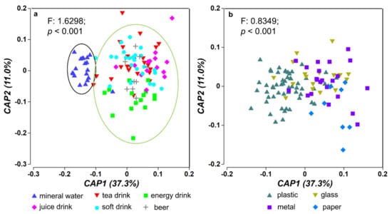 Plots of the canonical analysis of principal (CAP) of PAEs among different types of bottled drinks (a) and bottled drinks with different packaging materials (b). Permutational multivariate analysis of variance results are also shown in the figure.