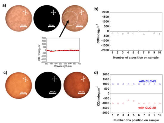 In contrast, as shown in Figure 3c, in the <HNF/cholesteric> state of P-9 doped with CLC-2R, two clearly different domains with opposite optical rotations could not be distinguished, indicating that one chiral domain possessing a uniform handedness of HNF could be formed across the sample. This was also supported by CD analysis. Large CD intensity with negative sign at ~400 nm was evaluated irrespective of the sample position during 10 observations, as shown in Figure 3d. We also performed CD analysis in the <HNF/cholesteric> state of P-9 doped with CLC-2S. Interestingly, large CD intensity with positive signs was always observed irrespective of the sample position during 10 observations. At 350–450 nm in the <HNF/cholesteric> state, R-chiral dopant systems (R1011) induced large CD signals with negative signs, whereas S-chiral dopant systems (S1011) induced large CD signals with positive signs without exception. These results strongly indicate that a mono domain with uniform handedness of HNF can be realized by blending the CLC-2 series, and the chiral sense of the HNF can also be controlled by the sense of the chiral dopant.