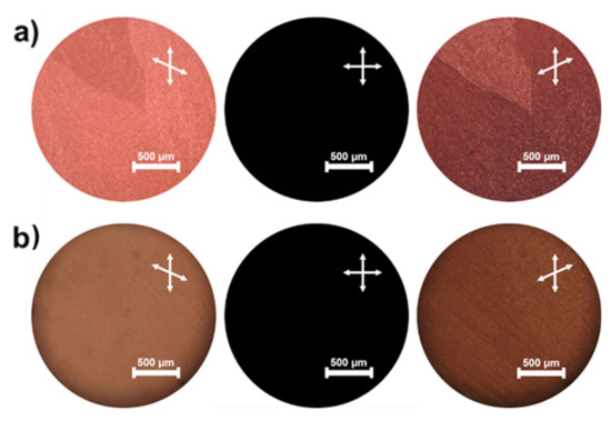 Since the discovery of chemically achiral bent-core (BC) molecules [10,11] that possess contradictory characteristics such as polarity and chirality, there have been many studies worldwide on unique LC phases originating from BC molecules. The unique LC phases related to BC molecules are different from conventional LC phases observed in rod-like molecules [10]. Among the unique LC phases, the B4 phase is a semi-crystalline phase with hexatic LC ordering [12], in which achiral BC molecules spontaneously form chiral superstructures, i.e., helical nanofilaments (HNFs) [13,14,15,16]. Therefore, the B4 phase is also called the HNF phase. Two spontaneously segregated chiral domains consisting of opposite-handed HNFs are formed in the B4 phase because the BC molecule is achiral. Two chiral domains originating from the two opposite handedness of the helix in the B4 phase are observed by conventional polarized optical microscopy (POM) [13]. The two domains become apparent as bright and dark regions when one of the polarizers is rotated clockwise by a small angle with respect to the crossed position, and the brightness of the two areas is interchanged when the polarizer is rotated counterclockwise. The observed texture exhibits grainy domains segregated into two chiral domains of equal probability, as shown in Figure 1a. Although the grainy domains with a certain chirality can be grown to a certain extent by mixing rod-like LC molecules, as shown in Figure 1b, two different domains with different chiralities appear because the BC molecules are chemically achiral.