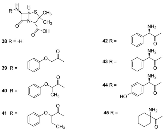 Semisynthetic penicillins. Phenoxyacyl penicillins: phenoxymethyl penicillin/penicillin V (Vepicombin, 39), phenoxyethyl penicillin (phenithicillin, 40), Phenoxypropylpenicillin (41) [63,64]. Aminoacylpenicillins ampicillin (42), epicillin (43), amoxicillin (44) and cyclacillin (45).