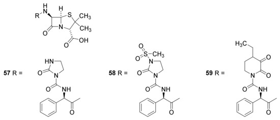 The ureidopenicillins azlocillin (Figure 13, 57), mezlocillin (58) and piperazillin (59) were developed in the 1970s. They are efficient for treatment of infections with Pseudomonas aeruginosa, Klebsiella and some Enterobacter species. Unfortunately, they have a poor effect on infections of Escherichia coli, Enterobacter and Salmonella species [38,83].