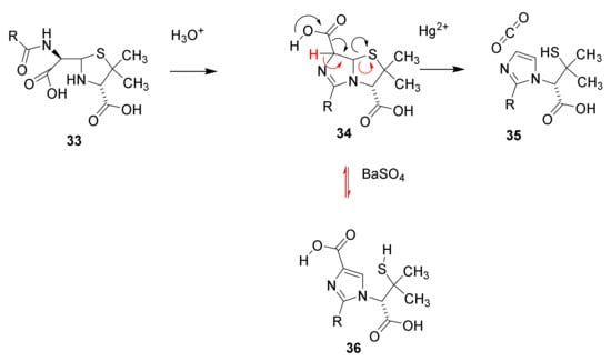 In aqueous solution pencillin is hydrolyzed (black arrows) to penicilloic acid (33), which rearranges into penillic acid (34). Catalyzed by mercury ions 34 is converted into penillamine (35), or catalyzed by barium sulfate (red arrows) isomerize into isopenicillic acid (36) by a retro Hetero-Michael addition [47,48].