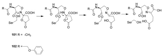 Tension in the β-lactam ring causes the lactam to be extremely reactive compared to other amides. The stability of amides is partly explained by the two resonance structures the amide and the zwitterionic structure. Tension in the four-membered lactam ring makes the zwitterionic resonance structure unfavorable (Scheme 4) [45,51]. As a consequence, penicillin reacts freely with alcohols. In penicillin-binding peptides a serine residue in the active site is esterified by the penicillins [52]. Other examples of reactive cyclic amides are known (see Section 9) [53].