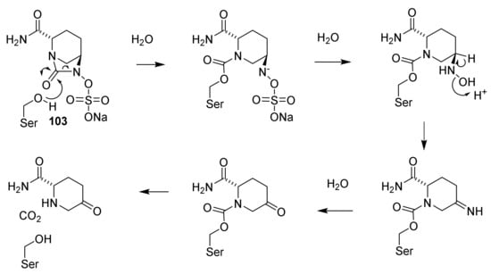 Already Fleming discovered that the growth of Balantidium coli and several other bacteria was resistant to penicillin G [40]. This observation was made before penicillin G (24) was taken to the clinic [69,70]. The resistant factor was transferred between different bacteria and was assumed to be an enzyme [71]. This assumption was confirmed by the discovery of the β-lactamases. These enzymes efficiently neutralize penicillins by opening the β-lactam ring to give penicilloic acid (33). Cleavage of the β-lactam ring removes the antibacterial effect [43,52,72]. In principle, this is the same acylation of a serine residue that occurs, when penicillins inactivates penicillin-binding proteins. However, the β-lactamases are not essential for the microorganism. Fast hydrolysis reactivates the enzyme enabling ring opening of other β-lactam rings [52]. Genes conferring resistance to antibiotics have been found in 30,000-year old organisms suggesting that resistance against antibiotics was invented by Nature millennia before mankind developed drugs against infectious diseases [70,73]. β-Lactamases are widely distributed [70,71,74,75] and have been studied intensive because of their ability to neutralize the clinical effect of penicillins. In several pathogenic organisms, expression of β-lactamases is provoked by β-lactam antibiotics [76]. The β-lactamases are divided into three classes A (penicillin-hydrolyzing), C (cephalosporin-hydrolyzing) and D (oxacillin-hydrolyzing) and Class B the metallo-β-lactamases [44,70,72,77]. Class C are primarily found in Gram-negative bacteria [44]. The cleaving catalyzed by serine-β-lactamases (Class A, C and D) involves a serine residue in the β-lactamases which react with the β-lactam to give an ester of the serine (Scheme 4). The enzyme penicillin complex is hydrolyzed to penicilloic acid (33) and reactivated β-lactamase [44,72,77]. In the metallo-β-lactamases a hydroxide complexed with two zinc ions in the active site opens the β-lactam [72]. A detailed mechanism of action of the different β-lactamases is given in some reviews [58,72].