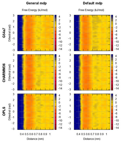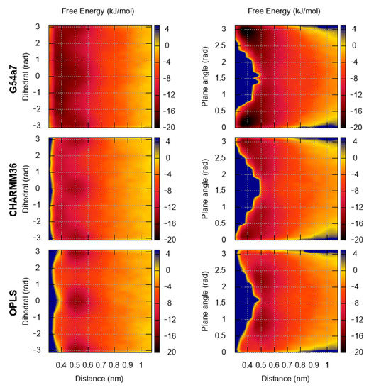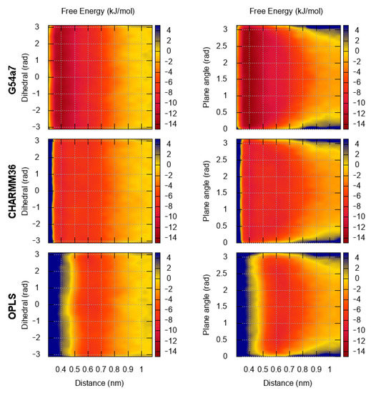 We conducted MD simulations to study the FES for the dimerization of small aromatic molecules and compare the obtained FES from different force fields. The parameters for all the simulated molecules were obtained from different online servers that generate topology and parameter files for each force field. Specifically, the automated topology builder (ATB) server [28] (https://atb.uq.edu.au/, accessed on 1–15 November 2018) was used for the GROMOS based G54a7 [37] simulations. ATB includes a large database of topologies for different molecules. In the cases in which optimized parameters for the molecules of interest were available, those parameters were chosen. The ATB entries are reported in the Supplementary Material, Table S1. The CGenFF server (https://cgenff.umaryland.edu/, accessed on 1–15 November 2018) was used to generate the CHARMM36/CGenFF [29] parameters, whereas for the OPLS [22] parameters, the LigParGen server [30,46,47] (http://zarbi.chem.yale.edu/ligpargen/, accessed on 1–15 November 2018) and the 1.14*CM1A-LBCC charge model were used [47].