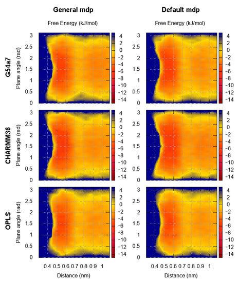 Regardless of the simulation setup, the binding energy and modes in the first interaction shell (∼0.4–0.7 nm) are almost identical. The only noticeable difference is seen in the G54a7 case, where the well in the second interaction shell (∼0.8–1.1 nm) is deeper ∼1–2 kJ/mol in the general setup compared to the simulation with the default parameters. Such differences might be proven important in some applications, but, as discussed later, we are mostly interested in the strength of binding and the orientation in the first interaction shell.