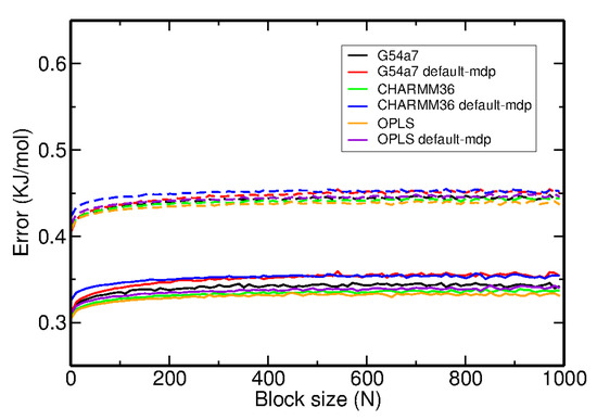 Apart from the water models, there are additional parameters that guarantee optimal performance when using each force field. In our case, we used the same cut-offs and parameters regardless of the force field to maintain simplicity and be consistent in the way the simulations were performed. This setup is referred to as general parameters. At the same time, we performed test simulations with setups as close as possible to the default parameters of each force field to evaluate the sensitivity of the results between the two setups. In the default G54a7 parameters, the group cut-off scheme was used with a twin range cut-off for the non-bonded interactions, where the short-range neighbor cut-off distance was set to 0.8 nm and the long range cut-off to 1.4 nm. In the CHARMM36 simulations, the LINCS algorithm was applied only to hydrogen atoms, the Verlet scheme was used with 1.2 nm distance cut-off and the long range electrostatic interactions were calculated with the particle mesh Ewald (PME) method [57]. As for the OPLS systems, the Verlet scheme was used with 1.0 nm distance cut-off and the PME method was used for the long range electrostatic interaction.