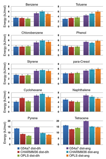 In this study, we compared the dimerization free energy surface (FES) and binding modes for a series of small aromatic molecules (Figure 1) between three commonly used MD force fields: CHARMM36 [36], G54a7 [37] and OPLS [22]. These molecules are usually encountered as solvents (e.g., benzene or cyclohexane) or as building blocks of biomolecules and nanomaterials. Previous MD studies showed that different force fields produce consistent results in terms of structural and energetic properties, and they are usually compatible with QM or experimental studies, when available [10,38,39]. Our study focuses on small aromatic molecules and shows that, regardless of the force field, the free energy of binding and the binding modes are roughly the same. However, applications involving larger aromatic molecules should be considered with care. Increasing the size of the molecules leads to significant deviations in the FES profiles.