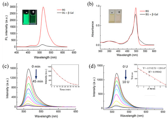 The sensing ability of BOD-Gal was first evaluated in vitro using β-Gal. The fluorescence and absorption responses of BOD-Gal (20 μM) in the absence and presence of β-Gal was recorded in aqueous solutions of phosphate-buffered saline (PBS) with dimethyl sulfoxide (DMSO) at a ratio of 49:1 (v:v) at a pH of 7.4, shown in Figure 1. The BOD-Gal displayed a strong green emission with a maximum at 516 nm, upon excitation at 470 nm. After BOD-Gal was incubated at 37 °C with β-Gal for 35 min, the fluorescence was reduced significantly as seen in Figure 1a. The UV spectra of BOD-Gal were investigated in the absence or presence of β-Gal. As shown in Figure 1b, the maximum absorption peaks were both at 498 nm, demonstrating that BOD-Gal enabled the assay of β-Gal based on a turn-off fluorescence mode.