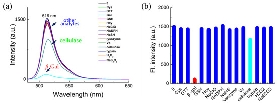 The potential interference of biological analytes toward BOD-Gal was investigated next. As shown in Figure 2, various enzyme species, amino acids and biomolecules, such as β-Gal, cellulase, lysozyme, trypsin, Cys, Hcy, GSH, DTT, NADPH, Vc, NaHS, Na2S2O3, H2O2 and NaClO, were reacted with BOD-Gal. Only β-Gal produced an obvious reduction in fluorescent intensity compared with only subtle changes for up to 100 equiv. of the other competitive analytes, showing that BOD-Gal demonstrated high selectivity for the detection of β-Gal.