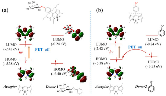 The DFT theoretical calculations were carried out at B3LYP/6-31 G*(d, p) level using Guassian 16 (considered as gas phase). The molecular structures were divided into “Acceptor” and “Donor” to discuss which was widely used as a computational model for the PET mechanism [20,21]. The results indicated that the highest occupied molecular orbital (HOMO, −5.38 eV) and lowest unoccupied molecular orbital (LUMO, −2.42 eV) energy levels of the acceptor (BODIPY unit) were ranged in between the HOMO (−2.04 eV) and LUMO (−6.40 eV) energy levels of donor 1 (Figure 3a), which implied that intramolecular charge transfer was forbidden, that is, PET progress was off. However, after the glyosidic bond of BOD-Gal was hydrolyzed by β-Gal to transform into a phenol anion subunit, the acceptor PET (a-PET) progress could be activated, where the HOMO energy level of donor 2 rose to −3.73 eV between the HOMO and LUMO energy of the acceptor part (Figure 3b) [22]. The optimized geometry and atom list were shown in Figures S3 and S4, Tables S1 and S2. Thus, the theoretical calculations gave a reasonable explanation of fluorescence on-off based on the PET mechanism.