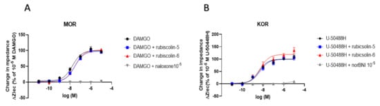 Evaluation of antagonistic effects induced by rubiscolins combined with positive control for MOR or KOR, observed using the CellKeyTM system. The cells expressing MOR (A) and KOR (B) were treated with each positive control alone or in combination with rubiscolin-5, rubiscolin-6, or 10−5 concentration of each negative control (10−11–10−5 M), and changes in impedance (ΔZiec) were measured using the CellKeyTM system. Concentration–response curves were prepared by calculating ΔZiec relative to the data obtained for each positive control: 10−5 M DAMGO for MOR (A) and 10−5 M U-50488H for KOR (B). All data points are presented as means ± S.E.M. for three independent experiments (n = 3–4).