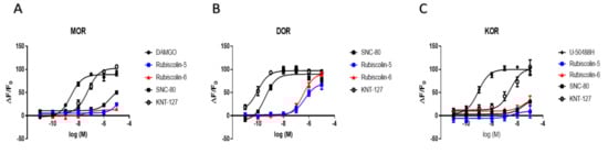 Effect of rubiscolins on MOR, DOR, and KOR, observed using the CellKeyTM system. The cells expressing MOR (A), DOR (B), and KOR (C) were treated with each compound (10−11–10−5 M), and changes in impedance (ΔZiec) were measured using the CellKeyTM system. Concentration–response curves were prepared by calculating ΔZiec relative to the data obtained for each positive control: 10−5 M DAMGO for MOR (A), 10−5 M SNC-80 for DOR (B), and 10−5 M U-50488H for KOR (C). All data points are presented as means ± S.E.M. for three independent experiments (n = 3–5).
