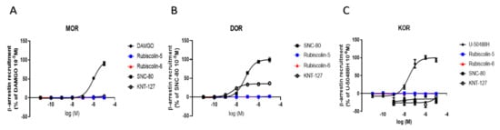 Levels of β-arrestin recruitment through OR induced by rubiscolin-5, rubiscolin-6, and opioid compounds. PathHunter® β-arrestin assay was performed in cells expressing MOR (A), DOR (B), and KOR (C) by treating with each compound (10−11–10−5 M). Concentration–response curves were prepared by calculating intracellular β-arrestin levels relative to the data obtained for each positive control: 10−5 M DAMGO for MOR (A), 10−5 M SNC-80 for DOR (B), and 10−6 M of U-50488H for KOR (C). All data points are presented as means ± S.E.M. for three independent experiments (n = 3–6).