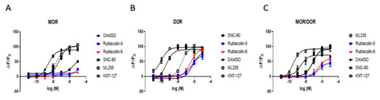 In the present study, we investigated the in vitro properties of rubiscolins in detail, including the agonistic or antagonistic effects for ORs and intracellular activities through the G-protein- and β-arrestin-mediated pathways, using MOR, DOR, KOR, and MOR/DOR heteromer.