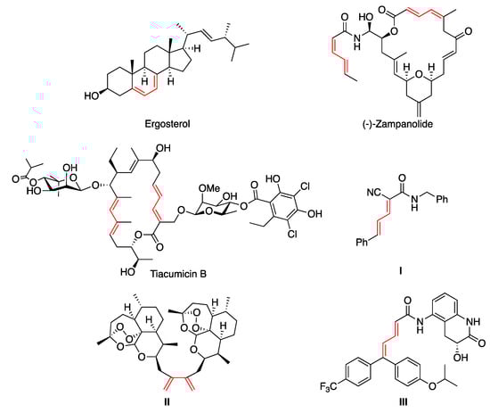 The 1,3-diene structural moiety represents the key framework of many natural [,,,] and non-natural [] products displaying a broad spectrum of biological activities []. Representative examples of natural products containing the 1,3-diene motif are the vitamin D2 precursor ergosterol (ergosta-5,7,22-trien-3-β-ol) [], the potent cytotoxic agent zampanolide [] and the macrolide antibiotic tiacumicin B [,] (Figure 1). Apart from natural dienes, synthetic ones have also aroused great pharmacological interest. For instance, 3-styrylacrylonitrile I exhibited high inhibitory potency against myeloid cell leukemia sequence 1 (Mcl-1) [], diene dimer II is a potent antimalarial [] and 5,5-diarylpentadienamide III is a transient receptor potential vanilloid antagonist I (TRPVI), of interest for the treatment of neuropathic pain [] (Figure 1).