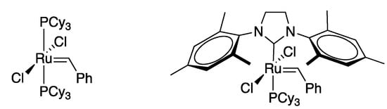 - Schwab, P.; Grubbs, R.H.; Ziller, J.W. Synthesis and applications of RuCl2(=CHR’)(PR3)2: The influence of the alkylidene moiety on metathesis activity. J. Am. Chem. Soc. 1996, 118, 100–110. [Google Scholar] [CrossRef]