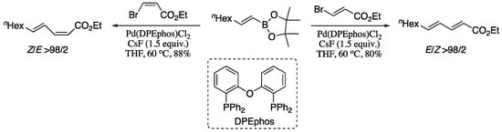 Among all the variants of the transition-metal-catalysed alkenyl–alkenyl coupling, the Pd-catalysed Suzuki-Miyaura coupling of stereodefined vinyl halides and vinylboranes reagents has long been regarded as a convenient method for the stereoselective construction of 1,3-dienes. However, stereo scrambling have been observed for several substrates. A representative example is the synthesis of dienoic esters; under Suzuki standard conditions, stereo scrambling to varying extents (≥5%) had been previously reported for the coupling of vinylboranes and 3-haloacrylates []. Negishi’s group found that the use of CsF as a base can suppress stereoisomerization, affording dienoic esters in good yield and excellent stereoisomeric ratio, as depicted in Scheme 1 [].