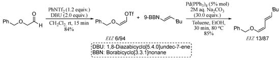 Several recent reports describe modified Suzuki coupling procedures for the highly stereoselective synthesis 1,3-dienes. In 2015, Kurosawa and co-workers described a useful synthetic sequence for the stereoselective synthesis of diverse olefin derivatives, including 1,3-dienes, based on a (Z)-selective vinyl-triflation of α-alkoxyacetoaldehydes, followed by Suzuki cross-coupling (Scheme 2) [].