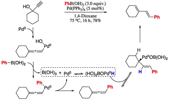 The classical Suzuki approach for the synthesis of dienes, however, requires the hydroboration of an alkyne using air and moisture sensitive boranes to generate the corresponding vinylborane, which cannot be stored for prolonged times. A recent Suzuki-based methodology which avoids the pre-formation of unstable boranes was reported in 2016 []. The protocol involves a palladium-mediated, base-free, Suzuki−Miyaura coupling of propargyl alcohols and boronic acids to generate the intermediate allenes, which were then converted in situ into the corresponding 1,3-dienes by means of a hydropalladation/dehydropalladation process promoted by the formation of boric acid within the base-free Suzuki−Miyaura reaction conditions (Scheme 3).